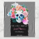This design features a watercolor skull surrounded with flowers with a black striped background, easy to personalise for any event.