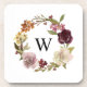 Customisable coaster featuring a burgundy, pink and white floral watercolor wreath with green foliage accents. This elegant wreath frames a classic black monogram. Easy to personalise and makes a great gift.
