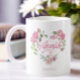 Soft pink watercolor flowers form a delicate wreath around the word “Bridesmaid,” creating a light and romantic look for bridal party gifts. Personalize the mug with a name to make each one special for the wedding celebration or bachelorette party.