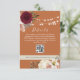 Elegant, rustic string lights, floral burgundy and orange wedding details card with QR code and website.