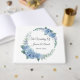 This wedding guest book is shown in a lovely watercolor floral wreath print of blue hydrangeas, text is shown in a slate grey colour.