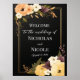 The welcome sign is usually displayed at the entrance of the wedding venue to greet guests and set the tone for the celebration. The poster can be customised to match the wedding theme, colours, and style, and may feature a photo of the happy couple to add a personal touch.