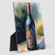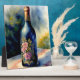 Pretty tabletop art for wine lovers features AI generated "still life" watercolor painting of a wine bottle adorned with a pink floral bouquet.