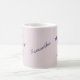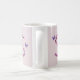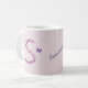 This beautiful and unique morning coffee or tea mug features a large letter S monogram initial. The letter S is created with pink flower petals and purple beads. Two purple butterflies flutter around the letter. The handmade letter is featured on either side of this mug with room in the centre to personalise with your name.