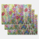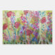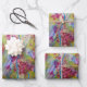 Colourful floral gift wrap pink flowers blue stems light green background created as mixed media artwork with acrylic paint pens, daubers, and washi-tape.