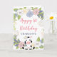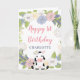 A cute floral wreath girl cow 1st birthday card. This custom first birthday card design features whimsical daisy flowers, leaves and cute cow illustration in pastel pink, purple and greens. Use the online template tools to personalise with a name.