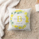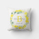 Beautiful Floral Wreath Personalised Wedding Throw Pillow | Yellow Green Grey White. Design by Elke Clarke©. Available at www.zazzle.com/monogramgallery. Rustic wedding theme with pretty shades of yellow, a wreath of flowers on a white background. Customisable with bride and groom names in grey script font, married last name initial in yellow and wedding date. Beautiful design is perfect for country yellow and white wedding and wedding anniversary keepsake gifts and other special occasions where monogram themes accessories add to the decor. Use edit menu to change colours or visit our store for more designs and colour options.