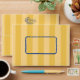Hand drawn frame over yellow striped background with blue line art floral design.