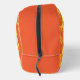 A colourful, lively two toned design with bright yellow and orange flowers against a striped yellow and orange background.