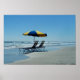 Beautiful posters to frame that feature a photograph of 2 beach chairs and a yellow and blue umbrella sitting along the shoreline of Daytona Beach, Florida. A beautiful blue sky and blue water with crashing waves is featured in this vacation photograph.