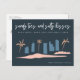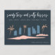Budget-friendly save the date postcards for your upcoming beach wedding in Miami Beach, Florida (or any other beach town). City with palm trees design that reads "Sandy toes and salty kisses" - customize the front and backside of the postcard with your wedding details.