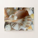 Square puzzle with photography of pretty Florida seashells. The left-handed lightning whelk is featured in two sizes, front and center, with colorful shells, sea urchin, jingle shells, and a puffy sand dollar in the background. This size only as the image is made to fit the square puzzle. Puzzles make great gifts, and can fill the hours on a bad weather day during a beach vacation.