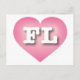 This postcard features a vibrant pink heart with a white washed centre containing the bold white upper case letters FL, the official abbreviation for Florida, the sunshine state. The reverse side of the postcard is blank, awaiting your handwritten sentiments or customised text.
