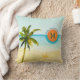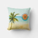 A peaceful watercolor scene of sky, sea and sand display a Florida beach with its majestic palm tree and our logo for "Florida... where the sun lives." Predominant colours are orange, turquoise, blue, green and, of course, sand. There's a spot for your monogram initial inside the sun graphic... or you can insert other text (or delete). The reverse side of the pillow shows a little more action, with two palm trees and a sailboat in the distance under a bright sunny sky.