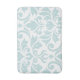 Vintage inspired damask surface pattern design in duck egg blue leaf and flourish detail on a white background.