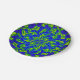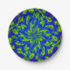 These decorative paper plates feature a colourful floral abstract circular mandala pattern of luminous greens and blues, with just a hint of purple and magenta at the corners, swirling around a central flower with kaleidoscope movement.