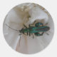 This sheet of round stickers features a photograph of a bluish green coloured British species of Flower Beetle sitting on a white Carnation flower. The photo was taken using macro photography to show the detail and colour of this beautiful beetle species.