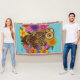 Owl sitting amongst a bouquet of colourful summer flowers in a backdrop of blue