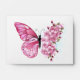 Flower arrangement of pink butterfly with pink Japanese cherry blossoms on white background.