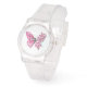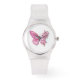 Flower arrangement of pink butterfly with pink Japanese cherry blossoms on white background.