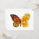 Orange, detailed monarch butterfly with wing decorated with yellow, vibrant California poppy on white background.