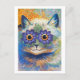 A fine art postcard with an animal illustration of a long-haired cat with purple flowers around the eyes, by the British artist Louis Wain (1860-1939). He was an illustrator best known for his drawings of cats during the art nouveau period.