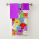 This towel set has a purple washcloth, a lighter purple hand towel, and a bath towel with a Spring design of scattered roses, pansies, daisies, and periwinkles.