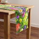 This decorative impressionistic floral table runner is covered with masses of flowers in every colour of the rainbow. Enjoy the yellow, orange, pink, red, blue, purple and white floral abstract pattern set on a background of green leaves. When viewing this artistic blanket, one is reminded of the gardens of French Impressionist paintings. What a lovely gift for gardeners!