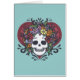 Pretty lady gardener's skull, with bouquet of flowers hair, on a heart with little swirlies. Vintage hippie distressing, muted colours, t-shirts, sweats, cards, gifts.