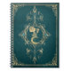 A magical grimoire notebook design with a moon, a rose and ornaments.