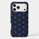 The flower of life symbol in a repeat pattern in blue detail on a black background.