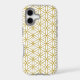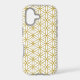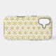 The flower of life symbol in a repeat pattern in gold detail on a white background.