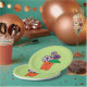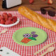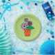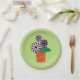 Cheery purple abstract daisies with a single green leaf in a bright orange flower pot make up the simple design on this personalised paper plate that is great for a summer birthday party.