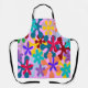 This apron has a 1970s retro design of overlapping flowers in red, blue, purple, yellow, orange, and red.
