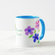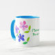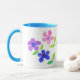 A chic white coffee mug with blue lip and handle, decorated with a floral motif, from a handpainted paper collage by Judy Adamson.