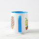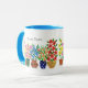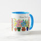 A white ringer mug with powder blue lip and handle and a row of pots of colourful flowers, from a handpainted paper collage by Judy Adamson. Customisable.