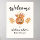 Flower Pumpkin Halloween Fall Baby Shower Welcome Sign, feature design with cute watercolor Halloween pumpkin and Fall/ boho leaves. Perfect for baby shower party welcome sign. baby expected in October, Fall, Autumn, Halloween.