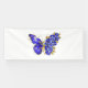 Jewellery, blue, sapphire, sparkling flower butterfly with wing decorated with blue, precious flowers with gold leaves on white background.