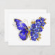 Jewelry, blue, sapphire, sparkling flower butterfly with wing decorated with blue, precious flowers with gold leaves on white background.