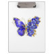 Jewellery, blue, sapphire, sparkling flower butterfly with wing decorated with blue, precious flowers with gold leaves on white background.