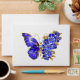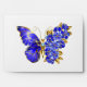 Jewellery, blue, sapphire, sparkling flower butterfly with wing decorated with blue, precious flowers with gold leaves on white background.