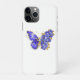 Jewellery, blue, sapphire, sparkling flower butterfly with wing decorated with blue, precious flowers with gold leaves on white background.