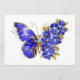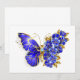 Jewellery, blue, sapphire, sparkling flower butterfly with wing decorated with blue, precious flowers with gold leaves on white background.
