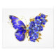 Jewellery, blue, sapphire, sparkling flower butterfly with wing decorated with blue, precious flowers with gold leaves on white background.