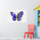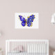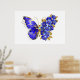 Jewellery, blue, sapphire, sparkling flower butterfly with wing decorated with blue, precious flowers with gold leaves on white background.