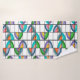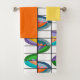This towel set has a yellow washcloth, an orange hand towel, and a bath towel with a Boho design of flowers inside ovals that have been split into quarters and placed on a grid.