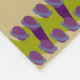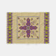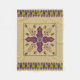 This blanket or throw blanket's design, art by Kristie Hubler, involved inspiration from jewellery and textiles from all around the world, around the equator, from archways, to flowers, to swags of floral sprays with dangling jewels, to eggs with flowers and jewels placed inside with a ribbon wrapped around it. In cool colours of purples, violets, sage, chartruese, and a muted periwinkle, on a tan background.