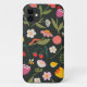 Cute iPhone case design. Spring flowers, birds, insects. Dark background. Colourful flowers.