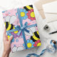 2 cute bumble bees with flowers. Surrounding these two big bumble bees are flowers in pink, purple, blue and yellow. Fully customisable and you can even personalise them. This colourful bee design is great for summer and bee lovers.