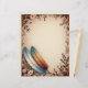 Cream-coloured flowers and coral buds, with two large quill feathers in blue, white, and bronze on a tan background makes a beautiful and striking letterhead paper. Very boho, and perfect for correspondance, a newsletter, or invitation.